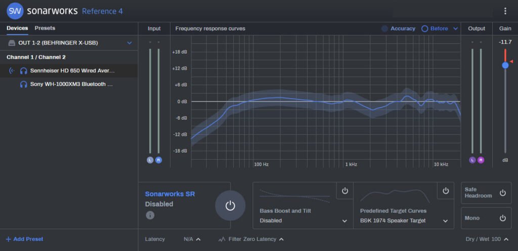Since the acoustics of my studio room is far from perfect, I decided to attempt to do a mix on my headphones (Sennheiser HD650). The HD650 has a quite flat frequency response but is not perfect. I intend to use it with Reference 4 (headphone edition) from Sonarworks, which removes unwanted coloration from the HD650 using a specific profile to flatten the frequency response. I use the profiles for the Sennheiser HD650 and the Sony WH-1000XM3 See also the review in SoundOnSound. Sonarworks allows you to send in your headphone for an individual calibration. I didn’t do that and probably wouldn’t notice the difference anyway.