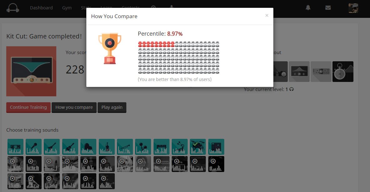 My very first workout with SoundGym. Already I am better then 8.97% of the world population in recognizing frequency attenuations!