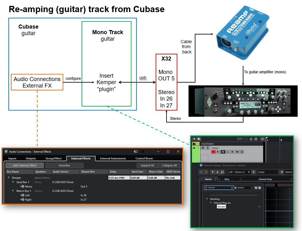 For mixing, I sometimes reamp DI guitar tracks using my Kemper Profiler. In Cubase Pro, one can configure an External FX connection (in Audio Connections). This External FX connection can then be inserted as a plugin on the audio track. The audio track is then routed to the X32 digital mixer where I route the signal to one of its physical outputs (OUT 5) that I connect to the ProRMP. From here, I connect to the Kemper and then route the stereo signal back to the X32, which I can record into Cubase.