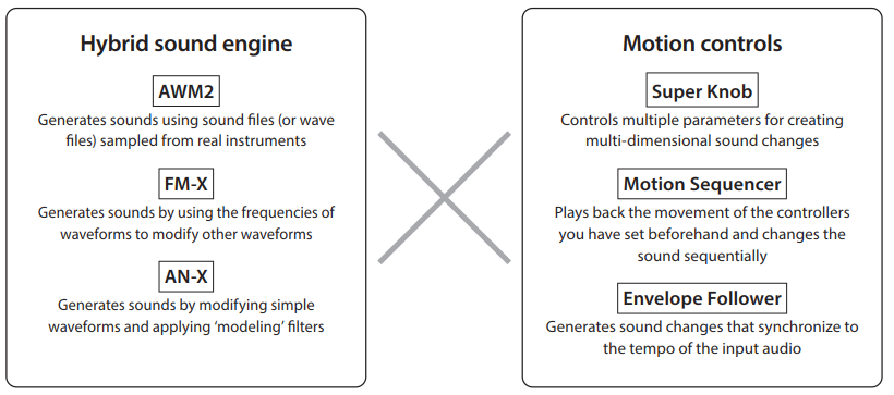 multi-textured sounds by combining AWM2, FM-X, and AN-X synthesis engines seamlessly and further modifying the sound using Motion control. It is a synthesis system that uses a hybrid, multi-tone-generator sound engine, and sophisticated motion controls with multiple control sources for creating complex and continuously shifting sonic textures.